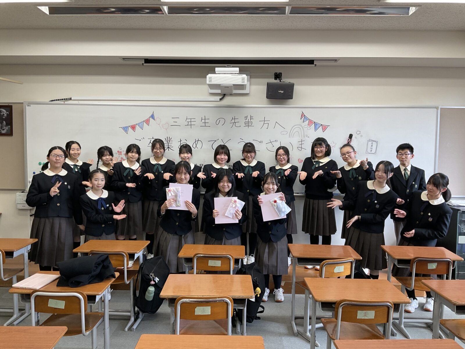 2026.03.11 競技かるた部 26.03.10中3生を送る会 3/14(土)の卒業式を前に、中3生を送る会をおこないました。 中2生が中心となって準備を進めてくれました。 3年生、卒業おめでとう。 高校生になっても活躍を期待しています! Posts navigation 前の記事 26.01.17京都大会DE級 結果報告