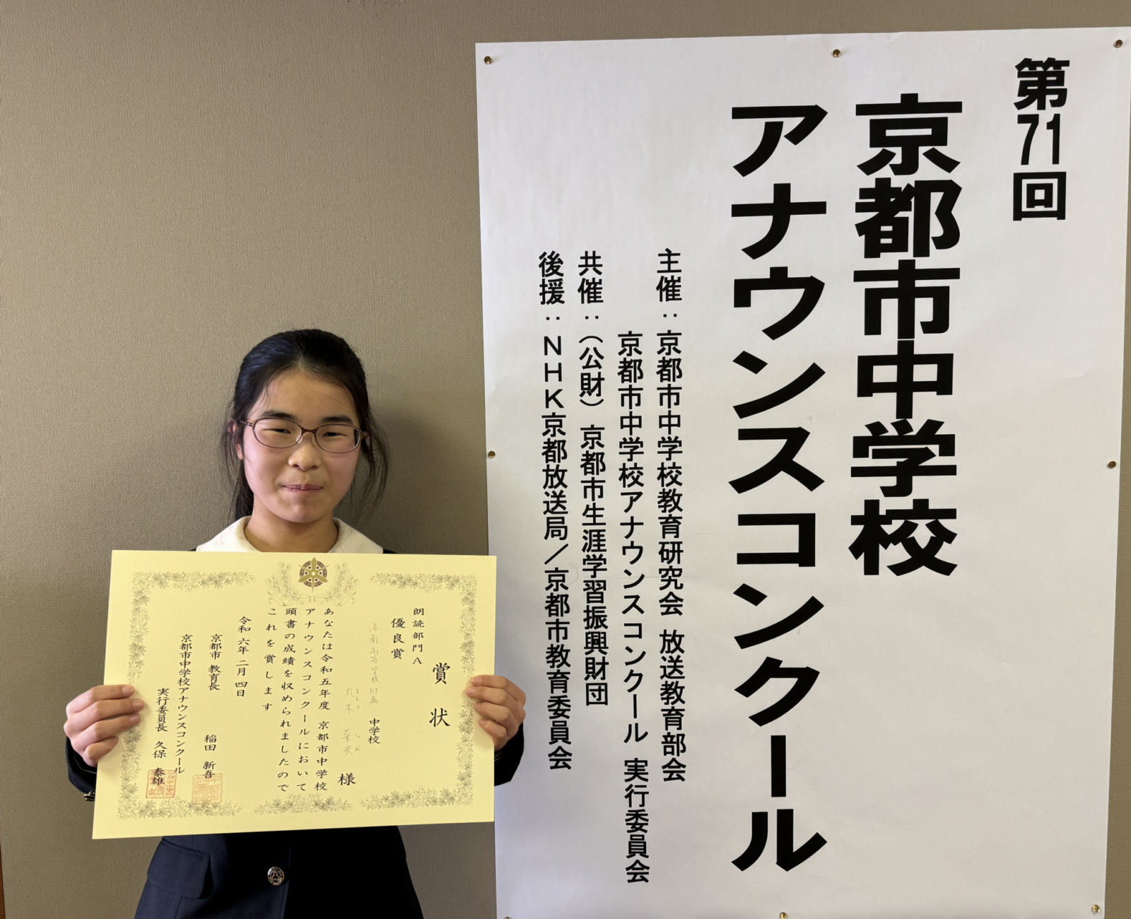 2024.02.05 2023年度クラブレポート 中学放送部 第71回京都市中学校アナウンスコンクール 第71回京都市中学校アナウンスコンクール 朗読部門A(近代文学部門)において 中学2年 丸木 菜央さんが 優良賞を獲得しました。