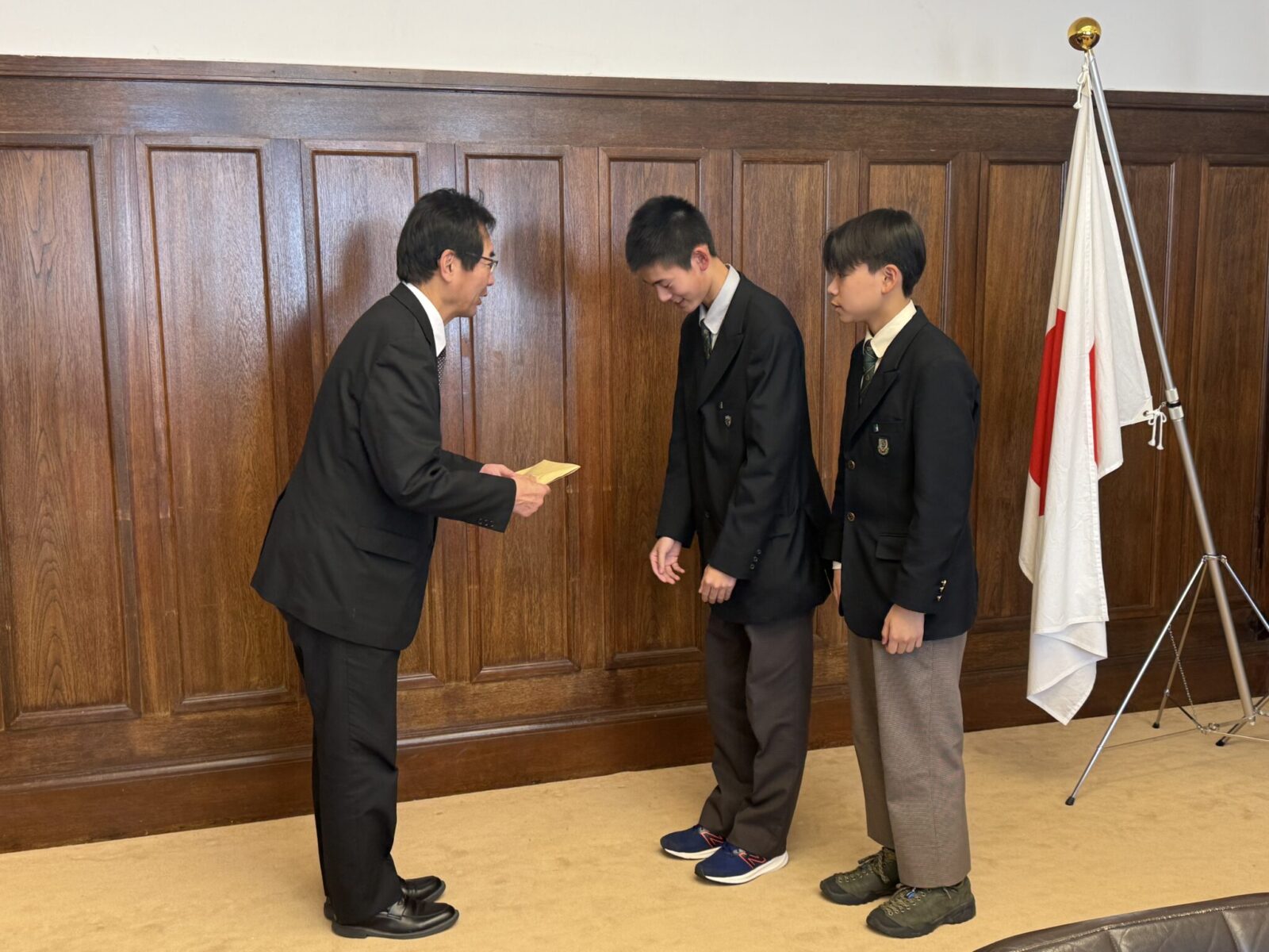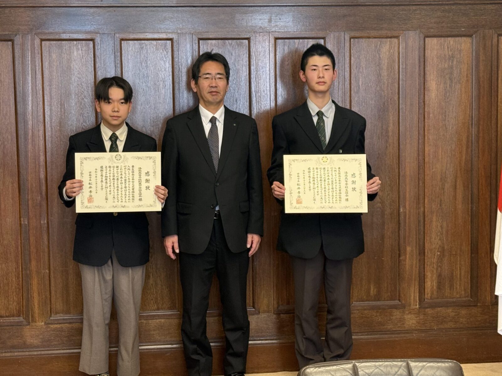 この募金は、高校生徒会長の河合堅くん、中学生徒会長の橋爪裕翔くん、そして高等学校校長の亀村俊実先生によって京都市役所へ届けられました。さらに、京都市長松井孝治さまからの感謝状が、京都市副市長吉田良比呂さまより授与されました。