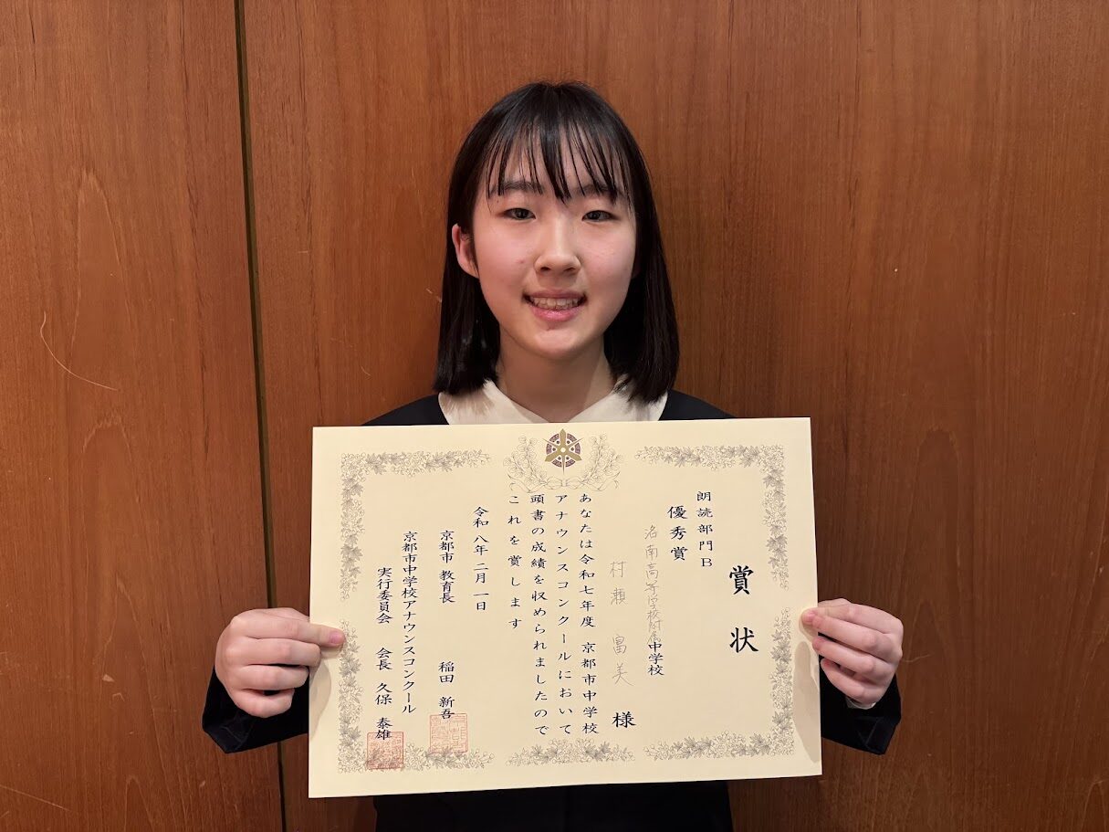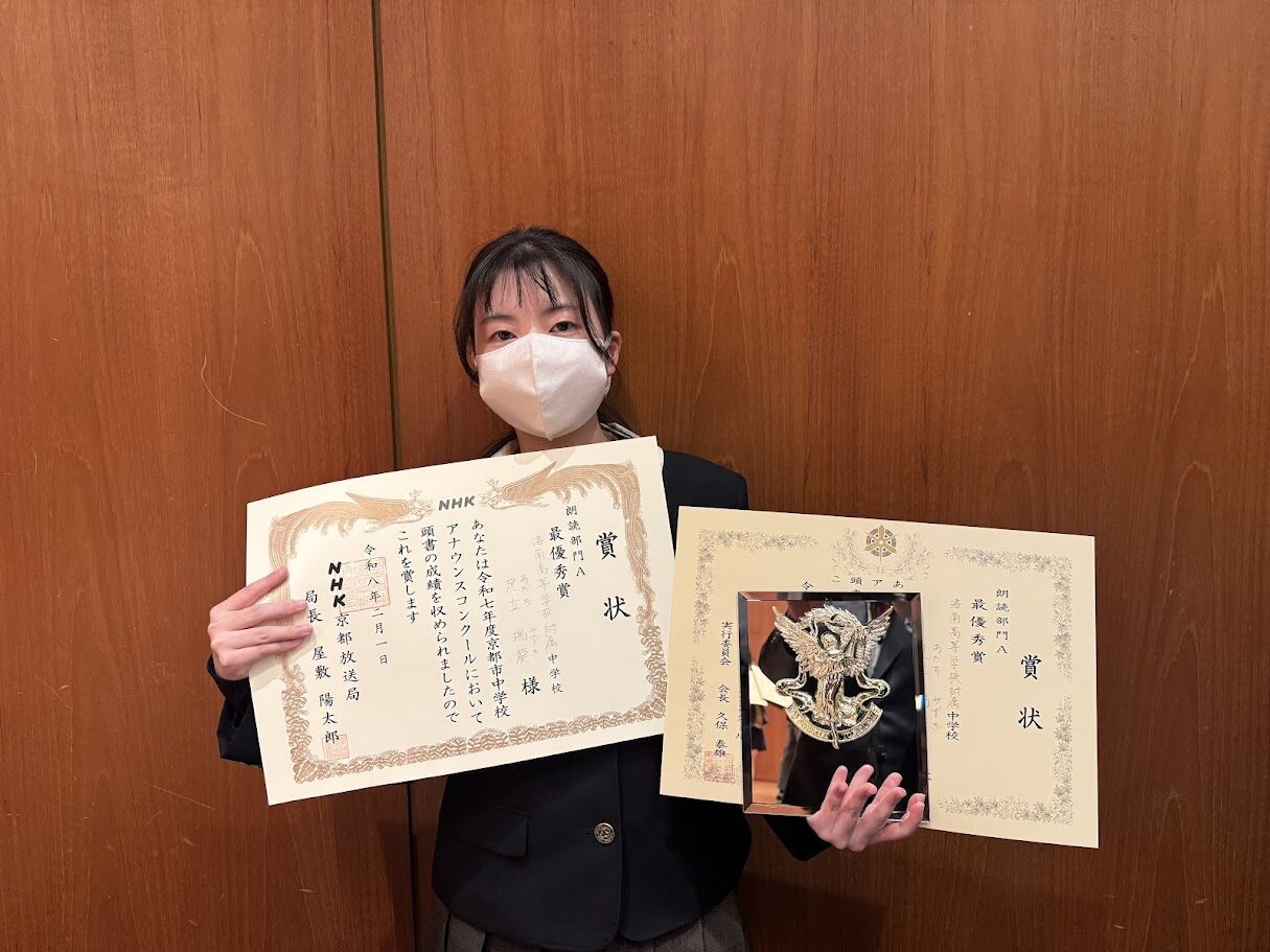 先日開催されました「第73回京都市中学校アナウンスコンクール」において、本校の放送部が出場し、見事団体部門で優勝を果たしました。